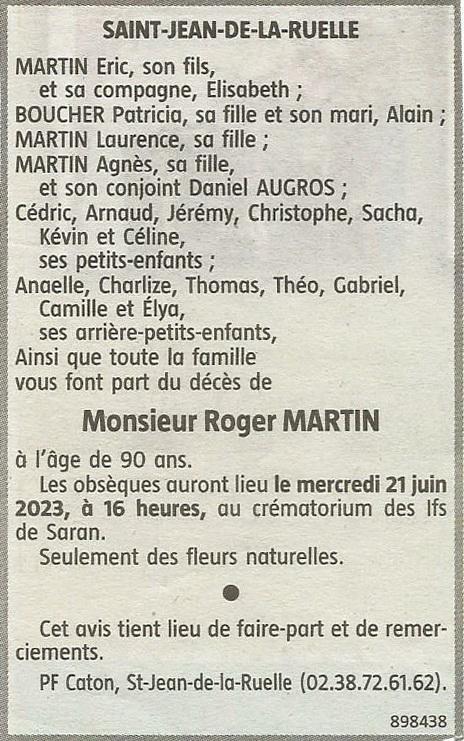 Juin 2023 - Triste nouvelle décès de M. Roger MARTIN